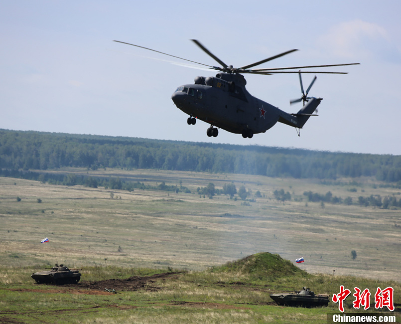 8月12日,“和平使命-2013”聯(lián)合反恐軍演中俄兩軍參演部隊在切巴爾庫爾合同訓練場舉行全員全要素實兵協(xié)同訓練。雙方共出動官兵近900人,坦克、步戰(zhàn)車、直升機等武器裝備約130臺,雙方導演部總導演——俄中部軍區(qū)司令員波格諾夫斯基和沈陽軍區(qū)副司令員石香元,共同到演習地觀摩并指導兩軍訓練。中新社發(fā) 李祥輝 攝