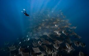 潛水員與數(shù)千條蝠鲼同游