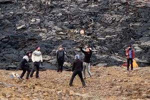 游客在火山旁打排球