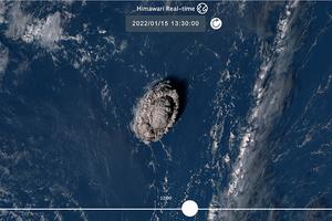 2022年1月14至1月15日,南太平洋島國湯加的洪阿哈阿帕伊島海底火山連續(xù)兩天劇烈噴發(fā)并引發(fā)海嘯。圖為2022年1月15日火山噴發(fā)前2小時衛(wèi)星拍攝到的畫面。