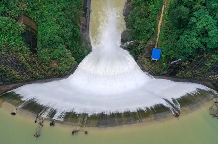 近日連降大雨,廣西桂林市全州縣源口水庫(kù)溢洪瀑布迎來(lái)最佳觀(guān)賞期。無(wú)人機(jī)俯瞰水庫(kù)溢洪口,一泓碧水從50余米壩面流落,宛如一把柔美的白色蒲扇輕柔落下,美輪美奐。源口水庫(kù)雨季溢洪場(chǎng)景已成為當(dāng)?shù)厥忻翊蚩ǖ亍?圖片來(lái)源:ICphoto