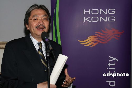 當(dāng)?shù)貢r(shí)間十月十六日晚,香港財(cái)政司長(zhǎng)曾俊華出席在倫敦舉辦的“香港電影季”活動(dòng),名為“香港制造:十年新電影”的展映是香港駐倫敦經(jīng)貿(mào)辦事處舉辦的香港回歸十周年系列慶;顒(dòng)之一。中新社發(fā) 李鵬 攝
