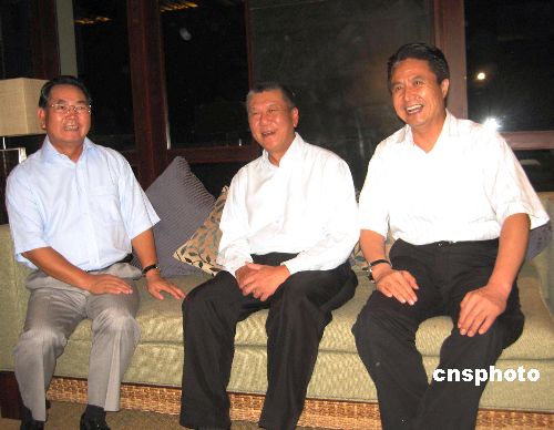 十月二十九日,澳門(mén)特別行政區(qū)行政長(zhǎng)官何厚鏵率澳門(mén)政府代表團(tuán)和澳門(mén)房地產(chǎn)企業(yè)家代表團(tuán)一行一百五十四人訪問(wèn)海南三亞。中共海南省委書(shū)記衛(wèi)留成(左)、海南省長(zhǎng)羅保銘(右)當(dāng)天在三亞希爾頓大酒店會(huì)見(jiàn)并宴請(qǐng)了何厚鏵一行。中新社發(fā) 尹海明 攝