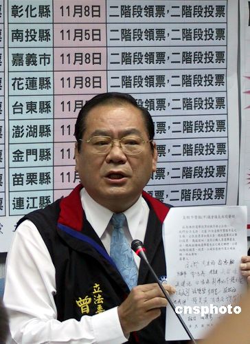 中國國民黨立法院黨團(tuán)十一月十四日表示,支持十八個縣市選舉委員會的決定,希望明年“立委”選舉與“公投”同日舉行時,采用“二階段領(lǐng)票,二階段投票”方式,讓選舉順暢單純。圖為國民黨政策會執(zhí)行長曾永權(quán)出示全臺灣二十五個縣市議會議長的共同聲明,他們表示支持這一投票方式。中新社發(fā) 劉舒凌 攝