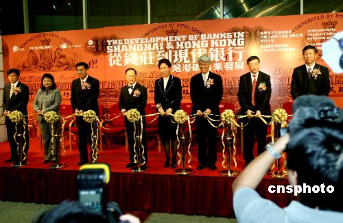 “從錢莊到現(xiàn)代銀行-滬港銀行業(yè)發(fā)展”展覽,十一月二十七日在香港歷史博物館開幕,行政長官曾蔭權(quán)(左4)、中央駐港聯(lián)絡(luò)辦公室副主任郭莉(右4)、中國工商銀行股份有限公司董事長姜建清(左3)、香港金融管理局總裁任志剛(右3)、特區(qū)民政事務(wù)局常任秘書長尤曾家麗、工商銀行上海分行行長孫持平(右2)、康樂及文化事務(wù)署署長周達明(左1)、工商銀行(亞洲)有限公司董事總經(jīng)理朱琦為活動剪彩。中新社發(fā) 王麗南 攝
