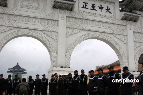 十二月五日,臺(tái)北“中正紀(jì)念堂”牌樓“大中至正”四字將拆除引發(fā)的風(fēng)波升級(jí),現(xiàn)場(chǎng)爆發(fā)數(shù)波零星沖突。圖為臺(tái)灣當(dāng)局調(diào)來上百名警察嚴(yán)陣以待。中新社發(fā) 董會(huì)峰 攝