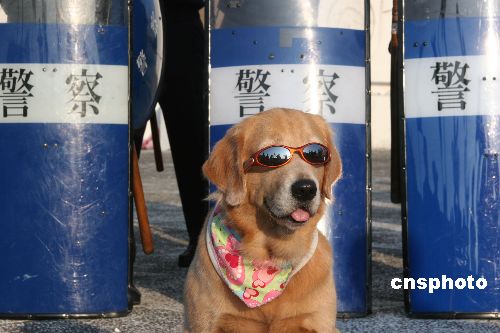 十二月六日,臺北“中正紀(jì)念館”在爭議聲中開始封館,“大中至正”牌樓將要拆除。圖為一只被主人戴上墨鏡的狗站在警察人墻前,成為媒體拍照“明星”。中新社發(fā) 董會峰 攝