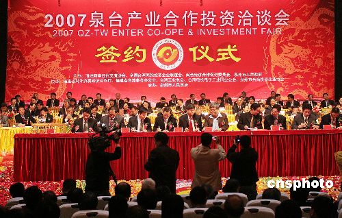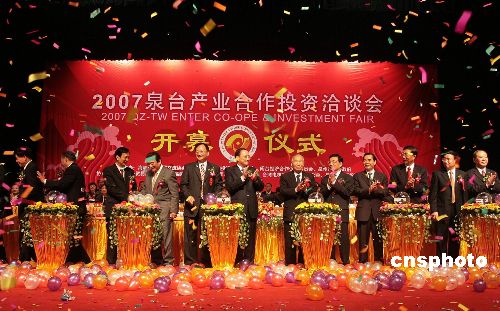 十二月十一日,“二00七泉臺產(chǎn)業(yè)合作投資洽談會”在僑鄉(xiāng)福建泉州開幕,商務(wù)部、國臺辦有關(guān)官員及臺灣島內(nèi)各界知名人士、在大陸臺商等千余嘉賓參加。本屆“產(chǎn)洽會”突出“產(chǎn)業(yè)合作、共謀雙贏”主題,集推介、論壇、洽談、簽約、考察為一體,旨在打造新的臺商投資聚集區(qū)。中新社發(fā) 傅丹丹 攝