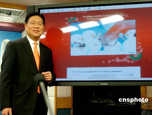 12月21日,香港商務(wù)及經(jīng)濟(jì)發(fā)展局局長(zhǎng)馬時(shí)亨主持2008年“數(shù)碼21”資訊科技策略新聞簡(jiǎn)報(bào)會(huì)。馬時(shí)亨即場(chǎng)發(fā)送電子賀咭予各個(gè)傳媒機(jī)構(gòu),祝愿圣誕節(jié)快樂(lè)。中新社發(fā) 鄧慶樂(lè) 攝