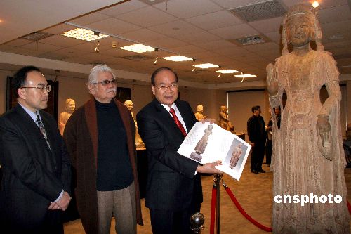 一月四日,臺灣中華皇家藝術(shù)博物館館長高崇云博士(左三)向觀眾介紹該館鎮(zhèn)館之寶——國寶級文物“大勢至菩薩”石像,并與山東省青州市龍興寺一九九六年出土的一尊“大勢至菩薩”進行比較。由該館推出的“中華瑰寶系列——宋朝漢白玉十八羅漢特展”當日在臺北開展。據(jù)考證,這尊高一百九十八厘米、石灰石貼金敷彩“大勢至菩薩”為東魏至北齊年間作品,距今約一千六百年至一千四百年。中新社發(fā) 孫自法 攝