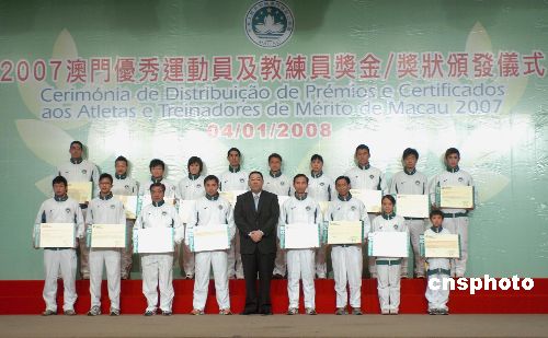 一月四日晚,澳門社會文化司崔世安司長在漁人碼頭向2007年澳門優(yōu)秀運動員及教練員頒發(fā)獎金和獎狀,以表揚他們在賽事中獲得的優(yōu)異成績。圖為崔世安司長與部分優(yōu)秀運動員教練員合影。中新社發(fā) 史利 攝