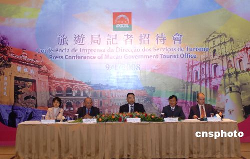 一月九日,崔世安(中)出席澳門旅游局在漁人碼頭舉行的記者招待會并答記者問。當(dāng)日,澳門旅游局公布﹐2007年澳門入境旅客超過2700萬人次,增幅為22.7%。中國內(nèi)地仍是最大市場,約占整體旅客的55%,其中48%為“個人游”旅客,其次是香港、臺灣旅客。中新社發(fā) 史利 攝