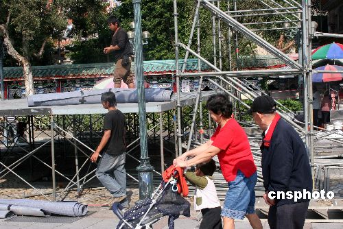 一月十一日,距臺灣“立委”選舉投票日只有一天。從中午開始,臺北市龍山寺前,工人在趕搭臨時(shí)舞臺,準(zhǔn)備供候選人晚上造勢,作最后沖刺。中新社發(fā) 陳立宇 攝