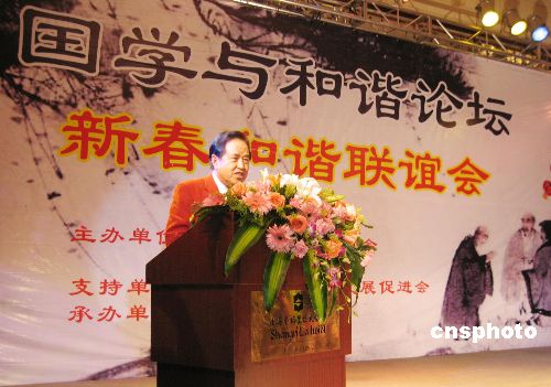 一月十一日,世界華人聯合總會會長賀興桐,在廣西北海市召開的全球華商“國學與和諧論壇暨新春和諧聯誼會”上致辭。當日,來自海內外五百余名華人華商匯聚該論壇,縱論“國學與和諧”,共商廣西北部灣經濟區(qū)及中國西部地區(qū)的創(chuàng)業(yè)大計。中新社發(fā) 馮抒敏 攝
