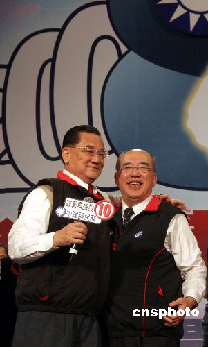 中國國民黨榮譽主席連戰(zhàn)(左)與國民黨主席吳伯雄共同為國民黨參選“立委”打氣、助威。