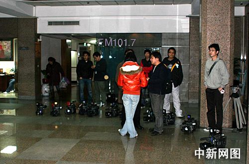 一月十八日,備受爭議的臺“教育部長”杜正勝傳出已口頭請辭。圖為今天傍晚守候在臺“教育部”門口大廳,等待杜正勝下班的臺媒記者。陳立宇 攝