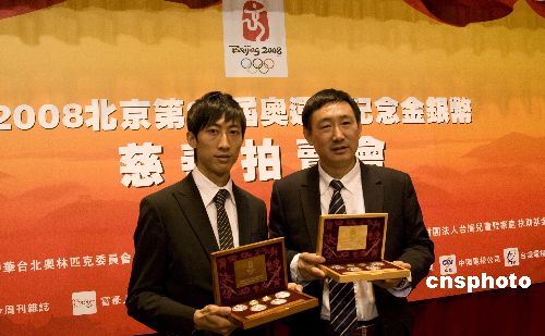 由中國臺北奧委會和臺灣大洋金銀幣有限公司共同主辦的“二00八北京第二十九屆奧運會紀(jì)念金銀幣慈善拍賣會”,將于一月二十七日下午在臺北信義誠品店展演廳登場,拍賣所得和拍賣底價的價差,將全數(shù)捐給財團法人臺灣兒童暨家庭扶助基金會,幫助弱勢兒童過好年。圖為臺灣的上屆奧運跆拳道冠軍朱木炎(左一),與臺灣大洋金銀幣有限公司總經(jīng)理畢海(右一),在一月二十五日的記者會上展示將拍賣的二00八北京奧運貴金屬金銀紀(jì)念幣。中新社發(fā) 陳立宇 攝