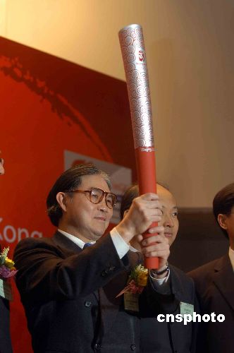 一月三十日,中國香港體育協(xié)會暨香港奧林匹克委員會會長霍震霆在新聞發(fā)布會上,展示北京奧運(yùn)會火炬。港協(xié)暨奧林匹克委員會當(dāng)天宣布,北京奧運(yùn)火炬?zhèn)魉蛯⒂诮衲晡逶露盏竭_(dá)香港,一百二十名火炬手,會在港九、新界等六個路段傳送火炬。中新社發(fā) 譚達(dá)明 攝