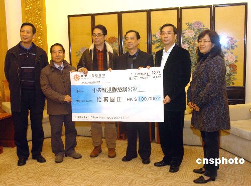 二月一日,香港工會聯(lián)合會(工聯(lián)會)理事長黃國建(左三)、副會長梁富華(左二)前往中央人民政府駐香港特別行政區(qū)聯(lián)絡(luò)辦公室(中聯(lián)辦),遞交港幣十萬元支票,救濟(jì)內(nèi)地雪災(zāi)受災(zāi)省區(qū)。中新社發(fā) 鄧慶樂 攝