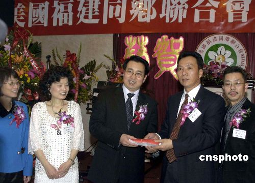 中國(guó)南方罕見(jiàn)雪災(zāi)牽動(dòng)在美福建僑胞的心。借當(dāng)?shù)貢r(shí)間3日美國(guó)福建同鄉(xiāng)聯(lián)合會(huì)成立周年慶典,在美謀生的福建鄉(xiāng)親發(fā)起捐款賑災(zāi)活動(dòng),短短一個(gè)小時(shí)內(nèi),募得一萬(wàn)二千五百余美元。圖為福建同鄉(xiāng)聯(lián)合會(huì)會(huì)長(zhǎng)陳榮華(右二)委托中國(guó)駐美大使館公使劉光源(中)將捐款轉(zhuǎn)交給祖國(guó)災(zāi)區(qū)人民,劉光源代表災(zāi)區(qū)人民表示感謝。中新社發(fā) 邱江波 攝