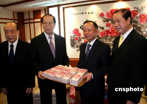 二月四日,曼谷,泰國(guó)中華總商會(huì)向中國(guó)雪災(zāi)災(zāi)區(qū)人民捐款現(xiàn)金五十萬(wàn)元人民幣。中國(guó)部分地區(qū)近來(lái)遭到嚴(yán)重雪災(zāi)的消息牽動(dòng)無(wú)數(shù)泰國(guó)華僑華人的心,泰國(guó)多個(gè)華人社團(tuán)、公司及個(gè)人,四日紛紛前往中國(guó)駐泰國(guó)大使館向?yàn)?zāi)區(qū)捐款救災(zāi)。泰國(guó)正大集團(tuán)、中華總商會(huì)、九屬會(huì)館、泰國(guó)進(jìn)出口商會(huì)、泰國(guó)各姓氏宗親總會(huì)聯(lián)合會(huì)、泰國(guó)報(bào)德善堂等華人公司和社團(tuán)的領(lǐng)導(dǎo)人,向中國(guó)駐泰大使張九桓(右二)轉(zhuǎn)交總計(jì)二百六十萬(wàn)元人民幣和二百萬(wàn)泰銖捐款。中新社發(fā) 顧時(shí)宏 攝