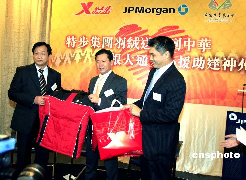 風(fēng)雪無情人有情,中國大陸南方雪災(zāi)繼續(xù)牽動眾多同胞的心。二月四日,中國運(yùn)動服裝品牌特步國際向雪災(zāi)嚴(yán)重地區(qū)江西省捐贈五千件總價值人民幣二百萬元的羽絨服,協(xié)助災(zāi)民疏緩眼前困境。圖為特步國際董事長丁水波(中)、中國扶貧基金會副秘書長楊青海(左)、摩根大通亞太地區(qū)股本資本市場主管吳繩祖出席香港的捐贈儀式。中新社發(fā) 王麗南 攝