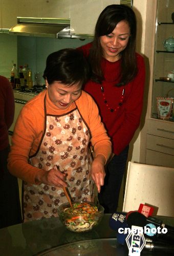 新春將至,臺灣二00八年“大選”國民黨副參選人蕭萬長的夫人朱俶賢(左),二月五日下午在友人家中做拿手菜“十全十美”,向民眾祝賀新年。中新社發(fā) 徐長安 攝