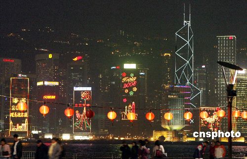 二月十日,游客在香港星光大道觀賞對岸風(fēng)景。春節(jié)期間,維港兩岸紅燈高掛,增添不少喜慶的過年氣氛。中新社發(fā) 武仲林 攝
