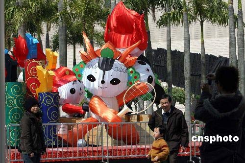 元宵佳節(jié)來臨之際,香港康文署斥資三百三十萬元,舉辦多個元宵彩燈會及展覽。在香港文化中心以奧運吉祥物“福娃” 為主題的花燈,吸引眾多游客觀賞。中新社發(fā) 洪少葵 攝