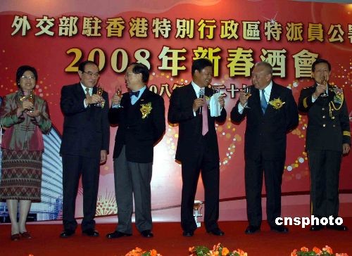 二月二十七日,外交部駐香港特別行政區(qū)特派員公署舉辦新春招待會,行政長官曾蔭權(quán)(左三)及外交部駐港特派員呂新華(右三)等出席。中新社發(fā) 譚達明 攝