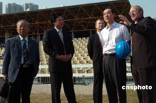三月四日下午,香港署理行政長官唐英年(右二)與多名局長、警務(wù)處長,連同北京奧組委官員參觀由沙田香港體育學(xué)院改建而成的奧運(yùn)及殘奧馬術(shù)主要比賽場地和相關(guān)配套工程。中新社發(fā) 譚達(dá)明 攝