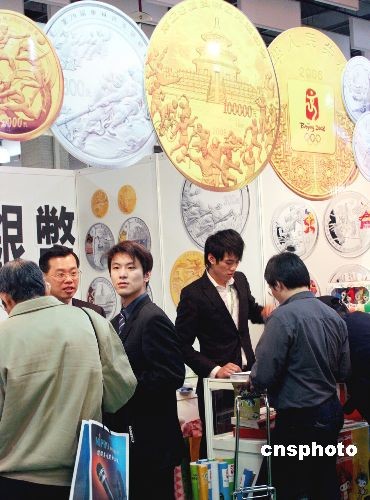 3月7日,為期5天的第21屆亞洲國際郵展在臺北開幕,展出競賽類、非競賽類及榮譽類的展品超過1000框。其中上海版飛雁加印小字郵票,紅印花加字郵票和大龍試印票等價值新臺幣上千萬元以上的珍稀郵票,最引人注目。圖為一家臺灣公司設(shè)攤展出北京奧運紀念金銀幣,并在現(xiàn)場向民眾贈送北京奧運吉祥物福娃宣傳海報。中新社發(fā) 黃少華 攝