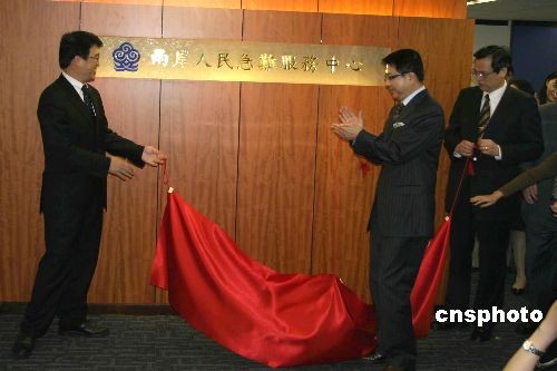 三月十二日,臺灣;鶗麻L洪奇昌(右二)、“陸委會主委”陳明通(右一)、;鶗貢L游盈隆(左一)為海基會兩岸人民急難服務(wù)中心揭牌。中新社發(fā) 曾嘉 攝
