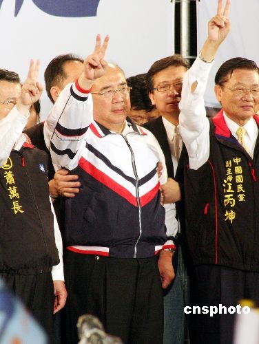 3月22日,臺灣舉行大選投票,結(jié)果中國國民黨候選人馬英九、蕭萬長以221萬票的領先優(yōu)勢獲勝,當晚大批支持者在馬蕭競選總部前集會歡慶。圖為中國國民黨主席吳伯雄在現(xiàn)場慶祝時,曾由他人幫忙攙扶。連日的輔選,使吳伯雄體力超支。中新社發(fā) 黃少華 攝