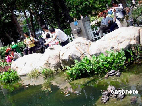 香港公園烏龜爭相爬上礁石享受春天陽光