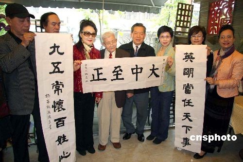 四月一日,臺(tái)灣知名書(shū)法家楊家麟(左四)在其八十八歲“生日文化小聚”上,現(xiàn)場(chǎng)書(shū)寫(xiě)自己創(chuàng)作的對(duì)聯(lián)贈(zèng)送馬英九,希望他常懷百姓之心,把臺(tái)灣經(jīng)濟(jì)搞好。左五為馬英九、蕭萬(wàn)長(zhǎng)派來(lái)的代表林先生。中新社發(fā) 董會(huì)峰 攝