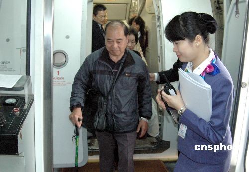 四月二日中午,臺(tái)灣復(fù)興航空公司兩岸清明包機(jī)抵達(dá)廈門機(jī)場(chǎng),揭開本次兩岸清明包機(jī)廈門航點(diǎn)序幕。圖為服務(wù)人員精心照料年歲較大的臺(tái)胞乘客。中新社發(fā) 陳悅 攝