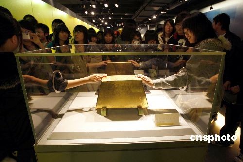 4月2日,游客在臺北黃金博物館園區(qū)參觀全世界最大的金磚,這塊金磚重達220公斤,是金瓜石黃金博物館園區(qū)的鎮(zhèn)館之寶,天天都有海內外大批游客慕名而來,除了親眼目睹世界之最,更在“伸手一摸”的沾染黃金貴氣。中新社發(fā) 杜洋 攝