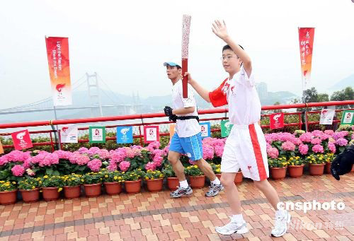 五月二日,奧運圣火在香港傳遞,手持北京奧運火炬的香港最年輕火炬手趙頌熙經(jīng)過香港地標青馬大橋。中新社發(fā) 洪少葵 攝