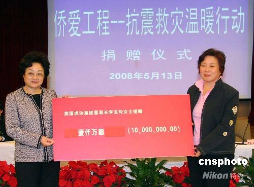 5月13日,國務(wù)院僑辦舉行“僑愛工程--抗震救災(zāi)溫暖行動(dòng)”捐款儀式,海外華商代表向國務(wù)院僑辦李海峰主任轉(zhuǎn)交了救災(zāi)善款。目前僑辦共收到泰國正大集團(tuán)、美國成功集團(tuán)董事長李玉玲女士等各界僑商的捐款共計(jì)6850萬元人民幣。圖為國務(wù)院僑辦李海峰主任(左)接受美國成功集團(tuán)董事長李玉玲女士(右)捐贈(zèng)的1000萬元人民幣。