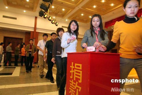 5月13日,國務院僑辦暨直屬單位在北京舉行為四川地震災區(qū)捐款活動。5月12日下午,四川省汶川縣發(fā)生7.8級大地震,四川部分地區(qū)受災嚴重,這場災難牽動著全中國人民的心。中新社發(fā) 張勤 攝