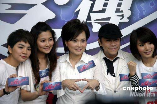 臺灣演藝界人士將于18日晚共同參與四川賑災晚會“把愛傳出去”。張小燕、張菲、吳宗憲、蔡康永、周杰倫等知名藝人接到邀請并積極投入晚會籌備工作,圖為名主持沈春華(中)、蔡康永(右二)與演唱組合SHE號召民眾以及更多藝人參與晚會及募款活動。中新社發(fā) 劉舒凌 攝