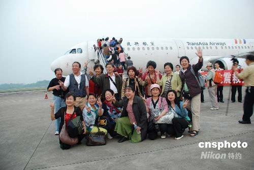 5月16日晚8時(shí)20分,165名被困九寨溝的臺(tái)灣游客乘坐臺(tái)灣復(fù)興航空公司飛機(jī)離開重慶返臺(tái)。從16日晚至17日凌晨,還將有臺(tái)灣中華航空公司、長(zhǎng)榮航空公司兩架飛機(jī)飛抵重慶,轉(zhuǎn)運(yùn)近七百名在四川災(zāi)區(qū)被困臺(tái)灣游客返家。圖為即將返家的臺(tái)胞們?cè)谥貞c機(jī)場(chǎng)合影留念。中新社發(fā) 康祖斌 攝