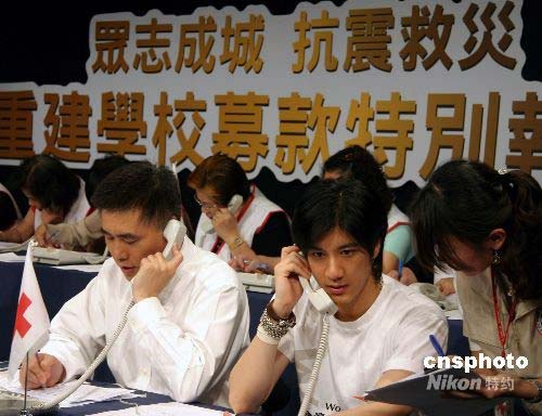 十七日,臺灣一電視臺與香港電視臺聯(lián)線舉辦“眾志成城抗震救災(zāi)重建學(xué)校募款特別報道”,協(xié)助四川震災(zāi)過后學(xué)校重建。圖為臺北市市長郝龍斌與歌手王力宏加入募款行列,擔(dān)任捐款專線接線志工,共襄義舉。中新社發(fā) 劉舒凌 攝