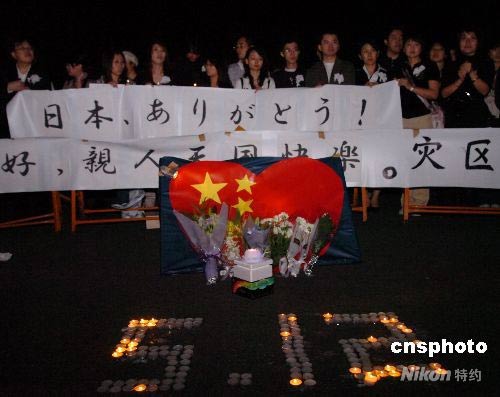 5月18日晚,150余位在日華人華僑和留學生自發(fā)來到東京市中心的新宿中央公園舉行燭光祈福活動,悼念5·12四川大地震遇難者。他們胸戴小白花、手持蠟燭,并打出“孩子一路走好”、“親人天國快樂”、“災區(qū)人民挺住”等橫幅。中新社發(fā) 朱沿華 攝