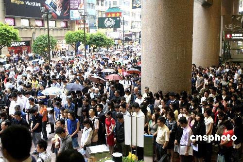 五月十九日下午二點(diǎn)二十八分,香港時(shí)代廣場(chǎng)眾多市民停住匆忙的腳步,為四川汶川大地震遇難同胞默哀三分鐘。中新社發(fā) 王麗南 攝