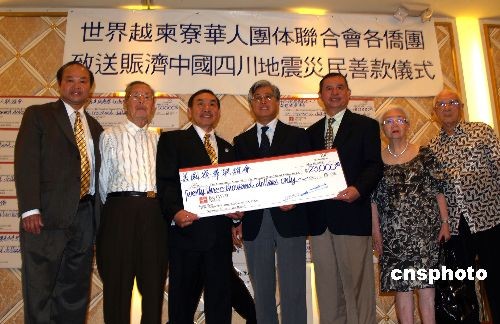5月19日,世界越柬寮團(tuán)體聯(lián)合會(huì)600多位華人華僑在洛杉磯舉辦向汶川地震災(zāi)區(qū)募款活動(dòng),他們集體起立默哀3分鐘,現(xiàn)場(chǎng)募款50萬(wàn)美金,當(dāng)即交由中國(guó)駐洛杉磯總領(lǐng)事館總領(lǐng)事張?jiān)?中)送汶川災(zāi)區(qū)。