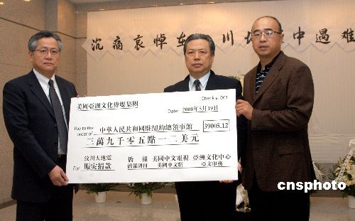 5月20日,美國亞洲文化傳媒集團(tuán)總裁蔣天龍(左)和美國《僑報》總裁李冰(右)前往中國駐紐約總領(lǐng)事館,代表集團(tuán)董事會及其屬下的《僑報》、美國中文電視、亞洲文化中心、美國中文網(wǎng)、《僑報周刊》的全體員工及其家屬,向中國地震災(zāi)區(qū)遇難同胞表示沉痛哀悼,并捐贈集團(tuán)同仁募集的款項3萬9千多美元。圖為中國駐紐約總領(lǐng)事彭克玉(中)代表領(lǐng)館接受捐款。中新社發(fā) 鄧悅 攝
