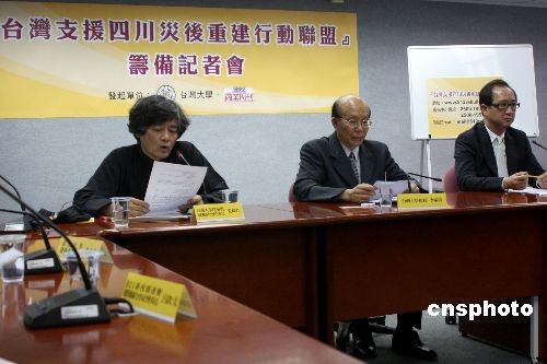 五月二十一日,臺灣大學(xué)與此間《商業(yè)周刊》發(fā)起成立“臺灣支援四川災(zāi)后重建行動聯(lián)盟”。圖為臺灣大學(xué)校長李嗣涔(中)、臺大建筑系城鄉(xiāng)研究所所長夏鑄九(左一)、《商業(yè)周刊》發(fā)行人金惟純出席記者會。中新社發(fā) 陳立宇 攝