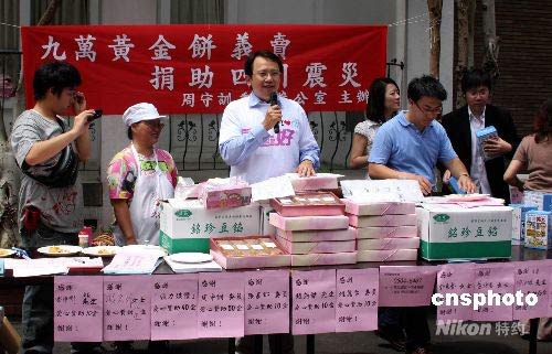 五月二十三日上午,國民黨“立委”周守訓(左三)與“牛媽媽公益之家”合辦(左二為牛媽媽),在臺灣“立法機關(guān)”內(nèi)義賣黃金餅,收入將全部捐給臺灣紅十字會,作為四川震災后的重建基金,該活動得到不少“立委”和工作人員的支持。中新社發(fā) 陳立宇 攝